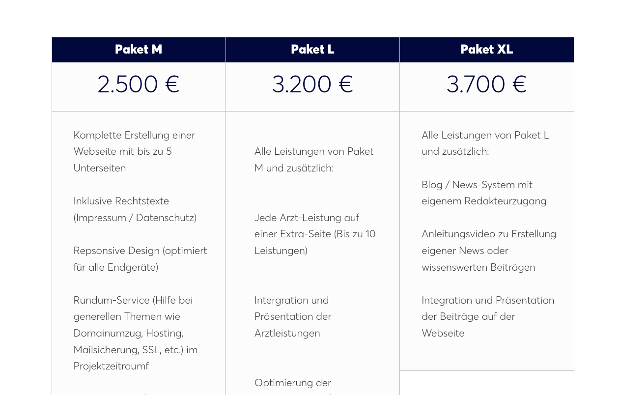 Wir stehen für klare und bezahlbare Preise und bieten Ihnen drei Preispakete für Ihre Praxiswebseite.